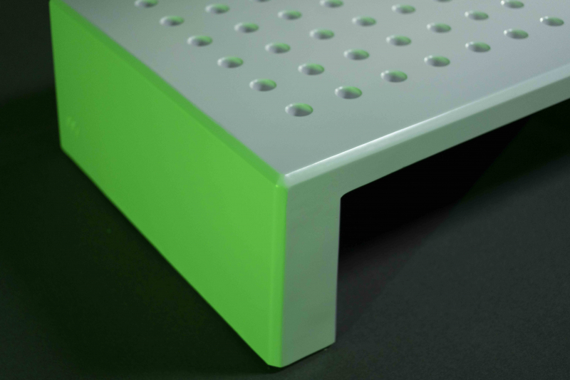 Las perforaciones de su gran superficie de asiento terminan de definir su imagen al tiempo que facilitan aspectos técnicos como: la evacuación de agua de su superficie, la mejora de la ventilación y la disminución de la temperatura bajo la acción del sol.