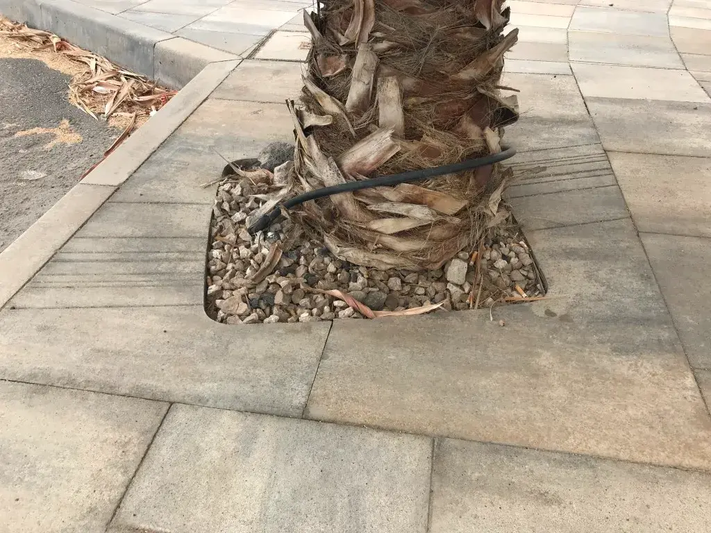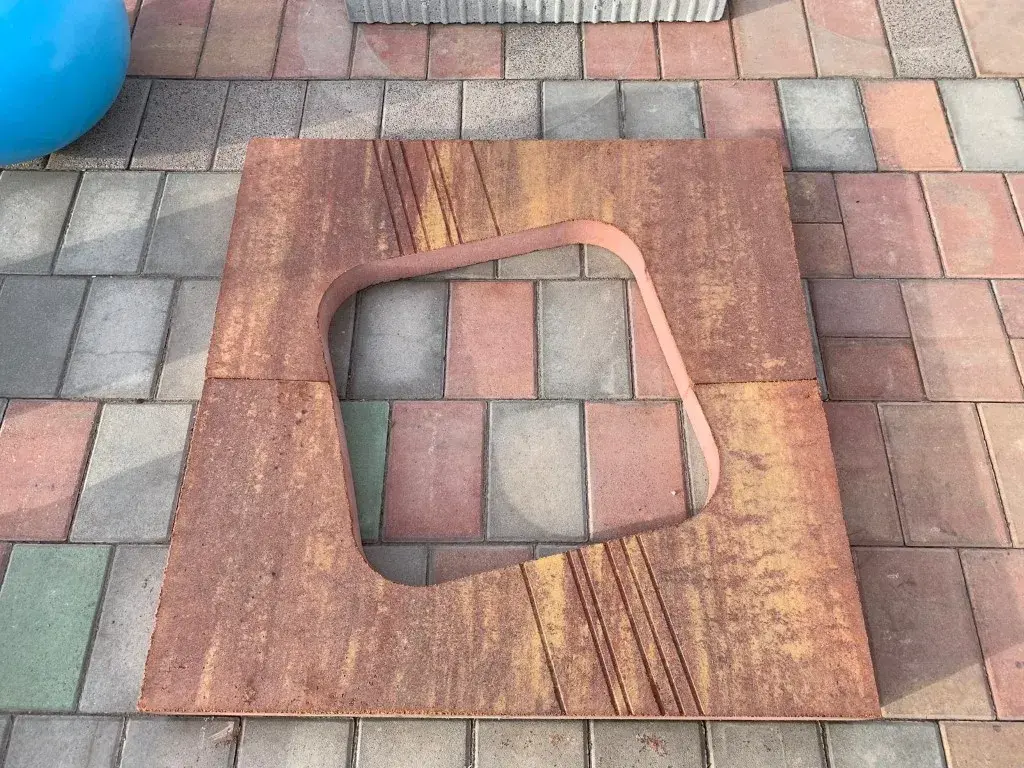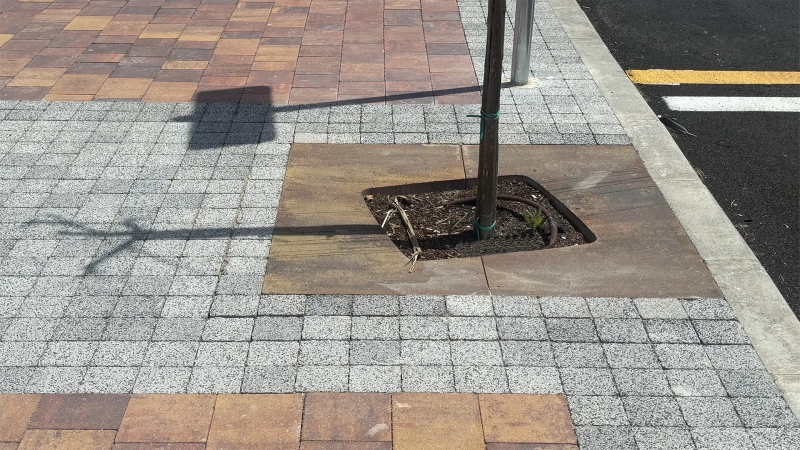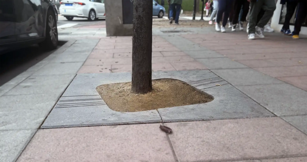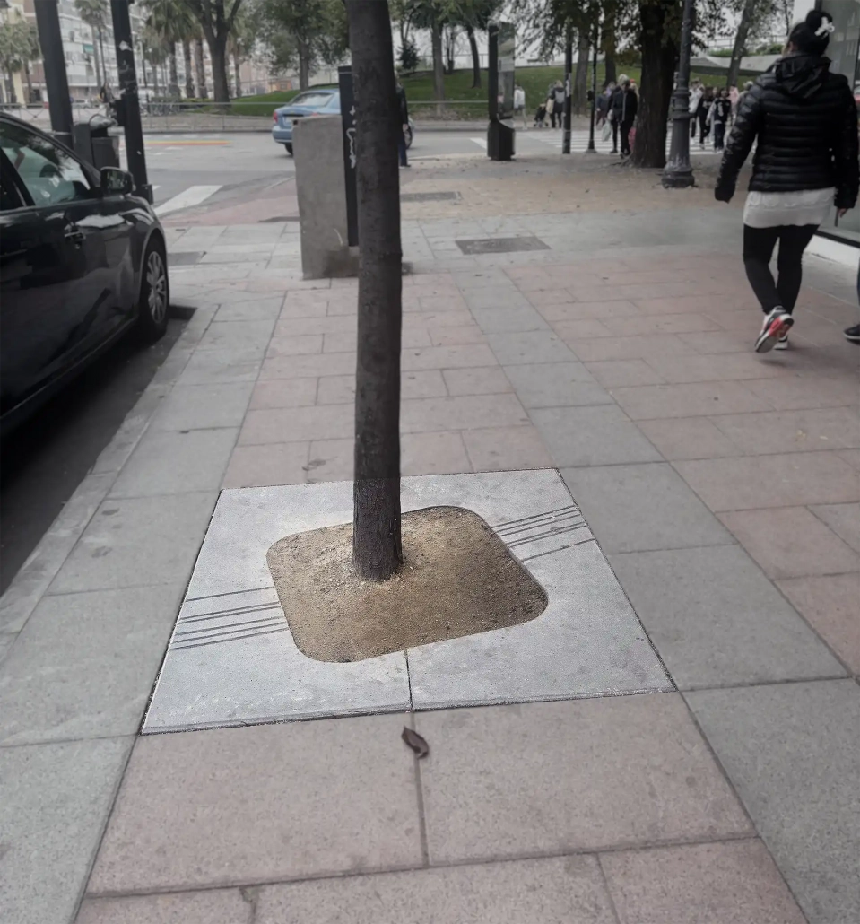 El modelo Fuerteventura® es un alcorque plano de 100 mm de espesor que juega con la oblicuidad en su diseño. La ventana central para plantación, un cuadrado de 700 mm de lado, está ligeramente girada respecto a las líneas perimetrales.