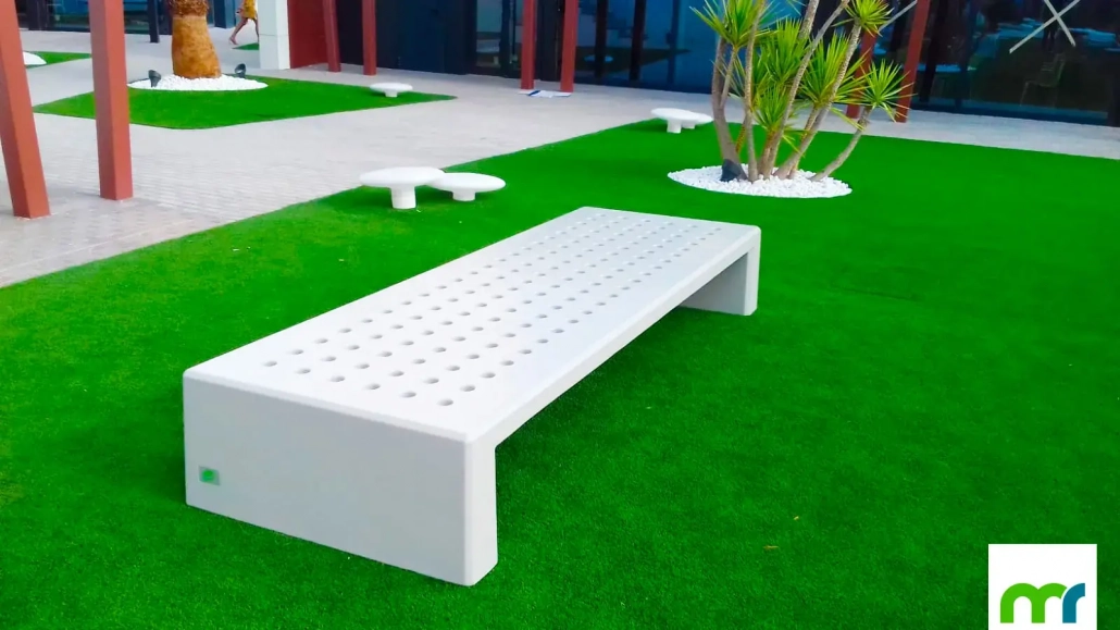 Su geometría ortogonal contrasta con las perforaciones cilíndricas que texturizan su gran plano de asiento y que le permiten evacuar el agua con eficacia aumentado su durabilidad.