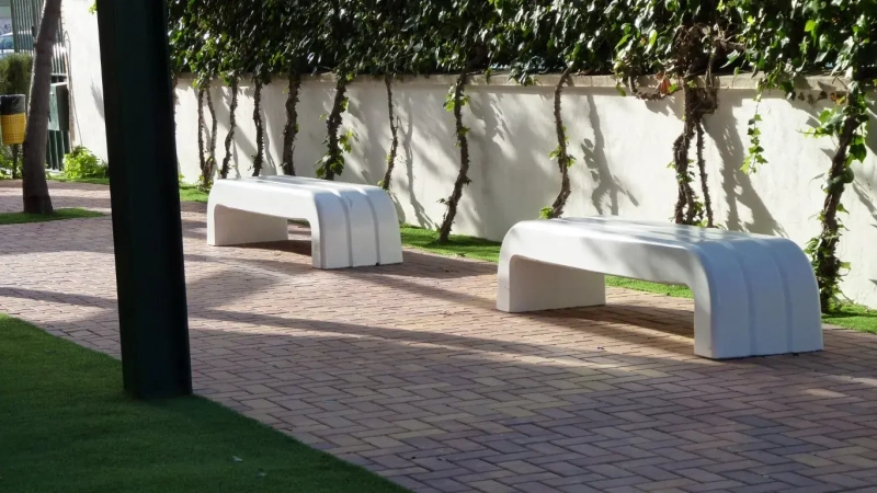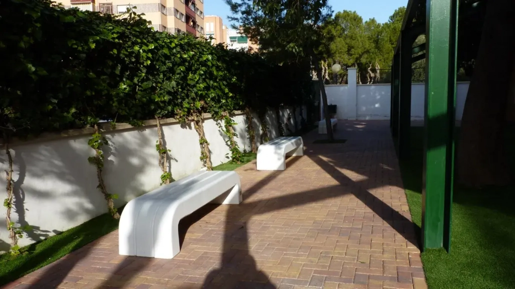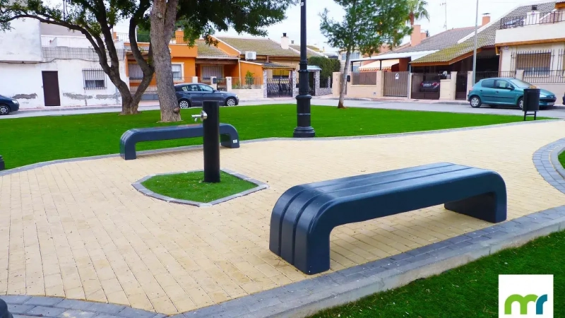 El banco Romo® es una pieza de geometría redondeada, con acanaladuras longitudinales y cantos redondeados.