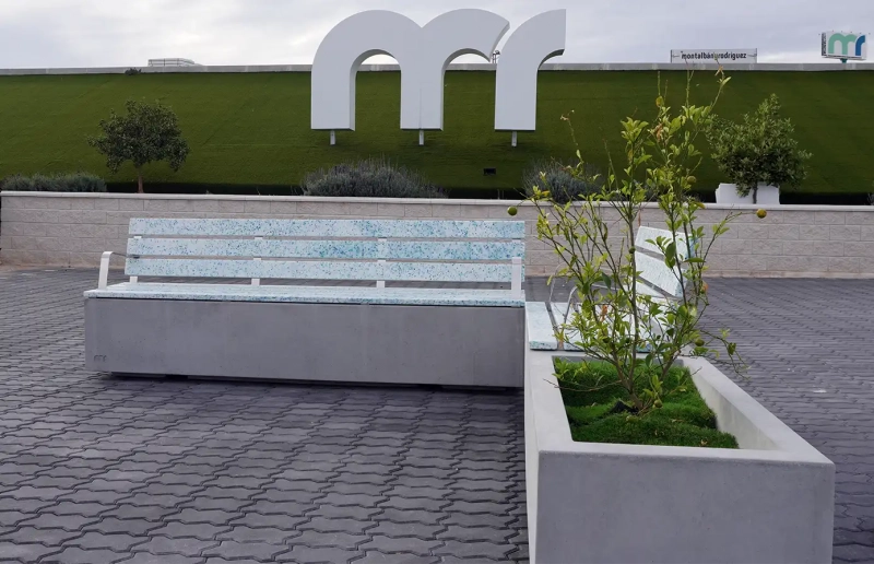 La base de hormigón tiene un acabado natural, incorporándose áridos reciclados (a partir de un 30%) y se aplica fotocatálisis en el acabado que permite neutralizar sustancias contaminantes presentes en el aire (NOx), además de mejorar la limpieza de la superficie.